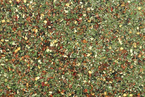 Směs bylinek a slaných květů na salát z rajčat a italského sýra Mozzarella.